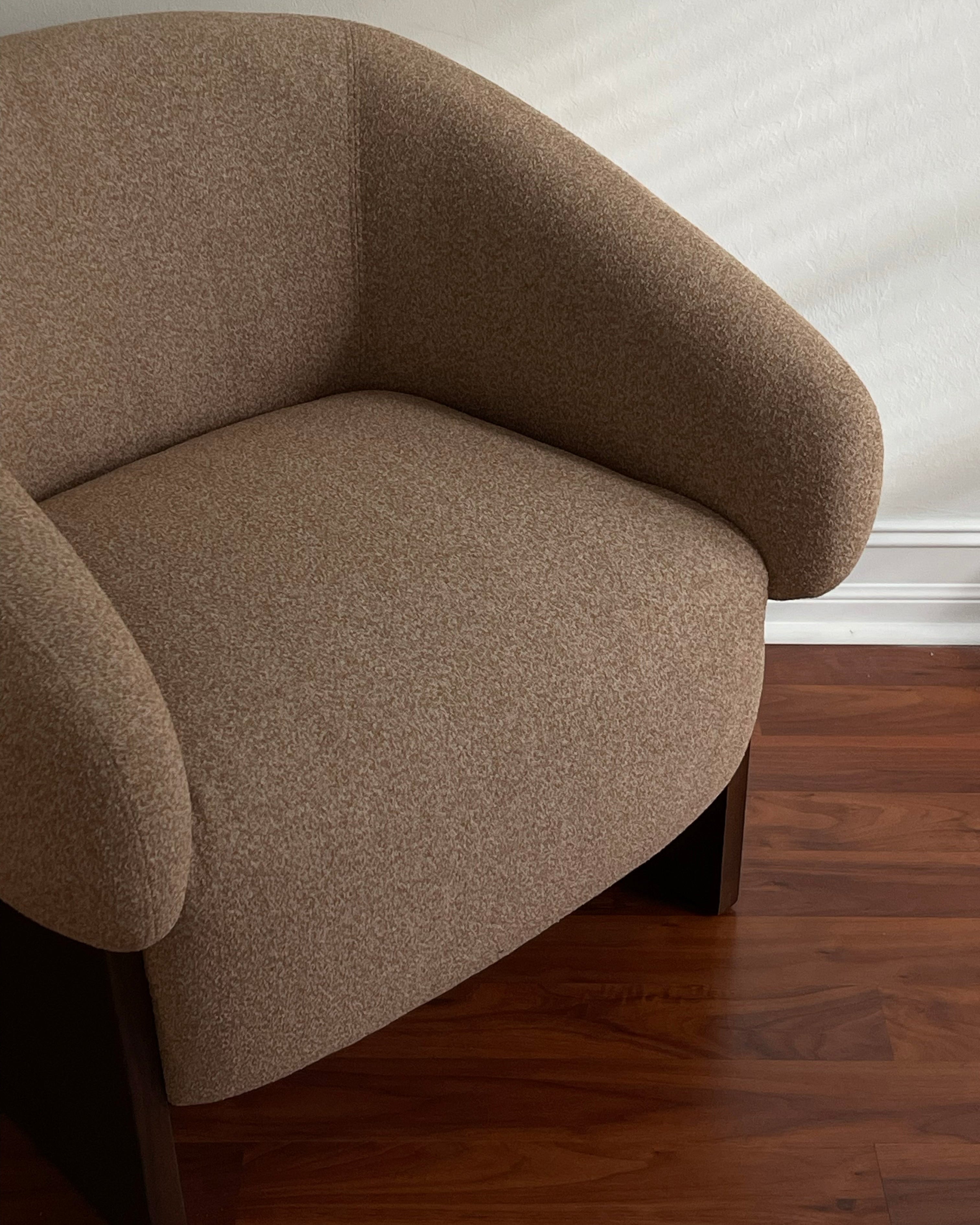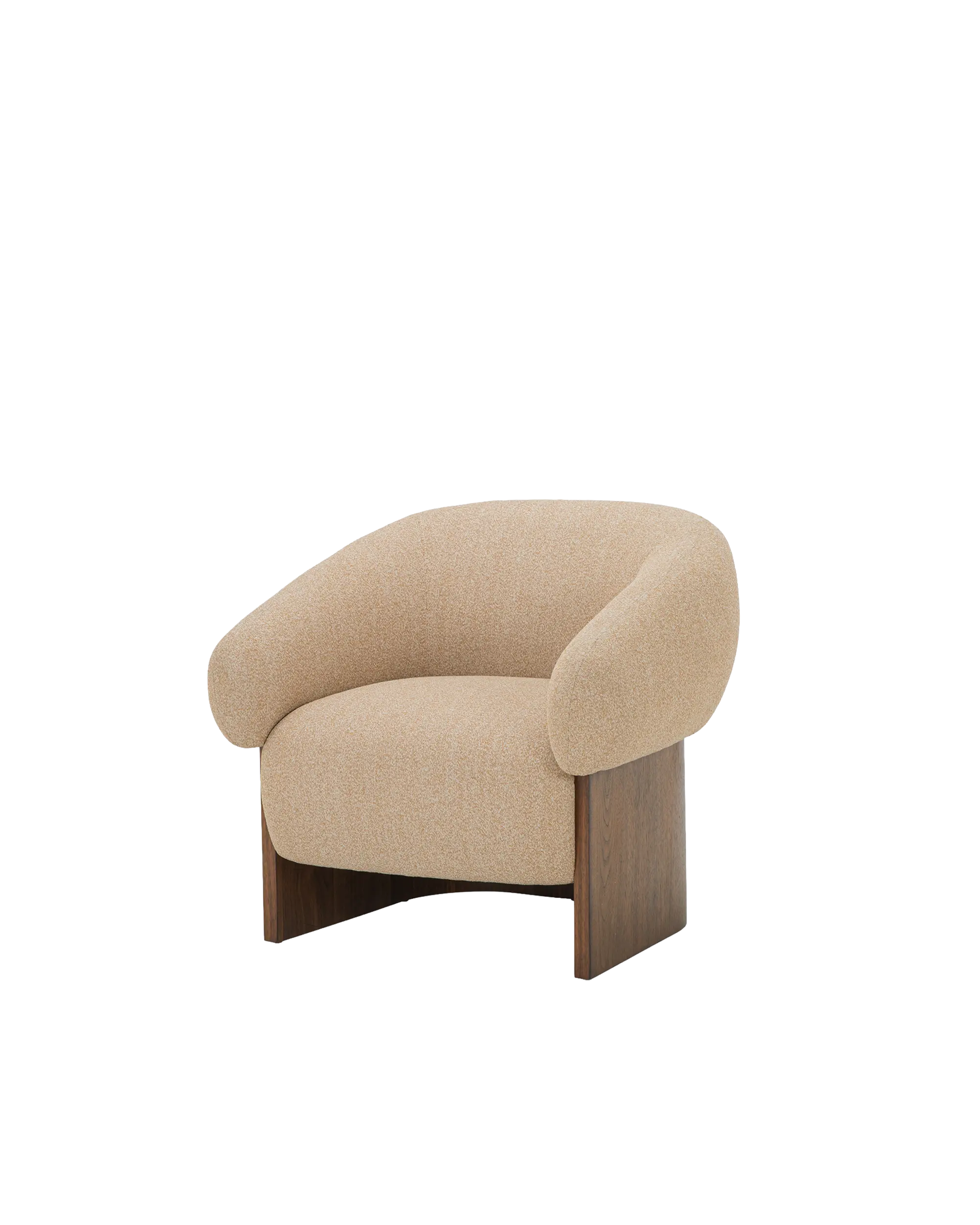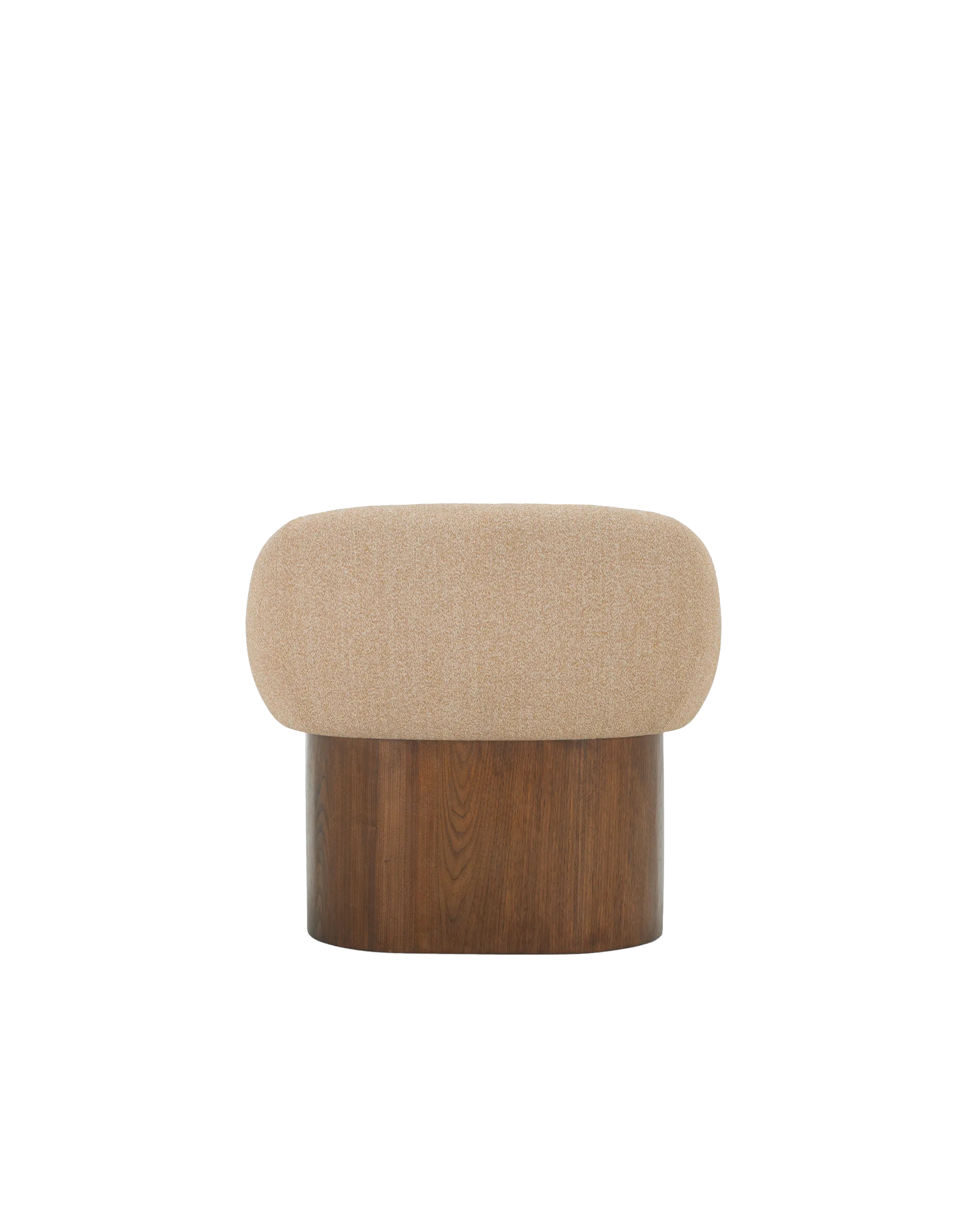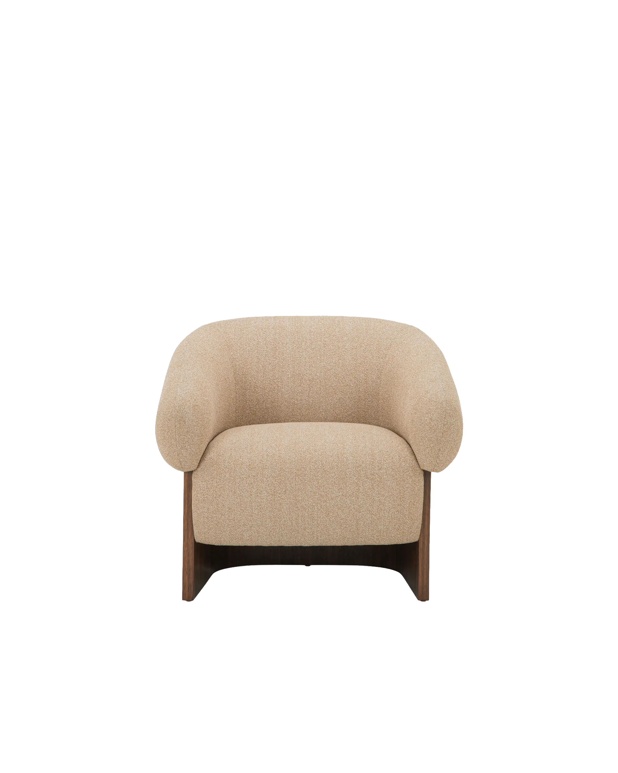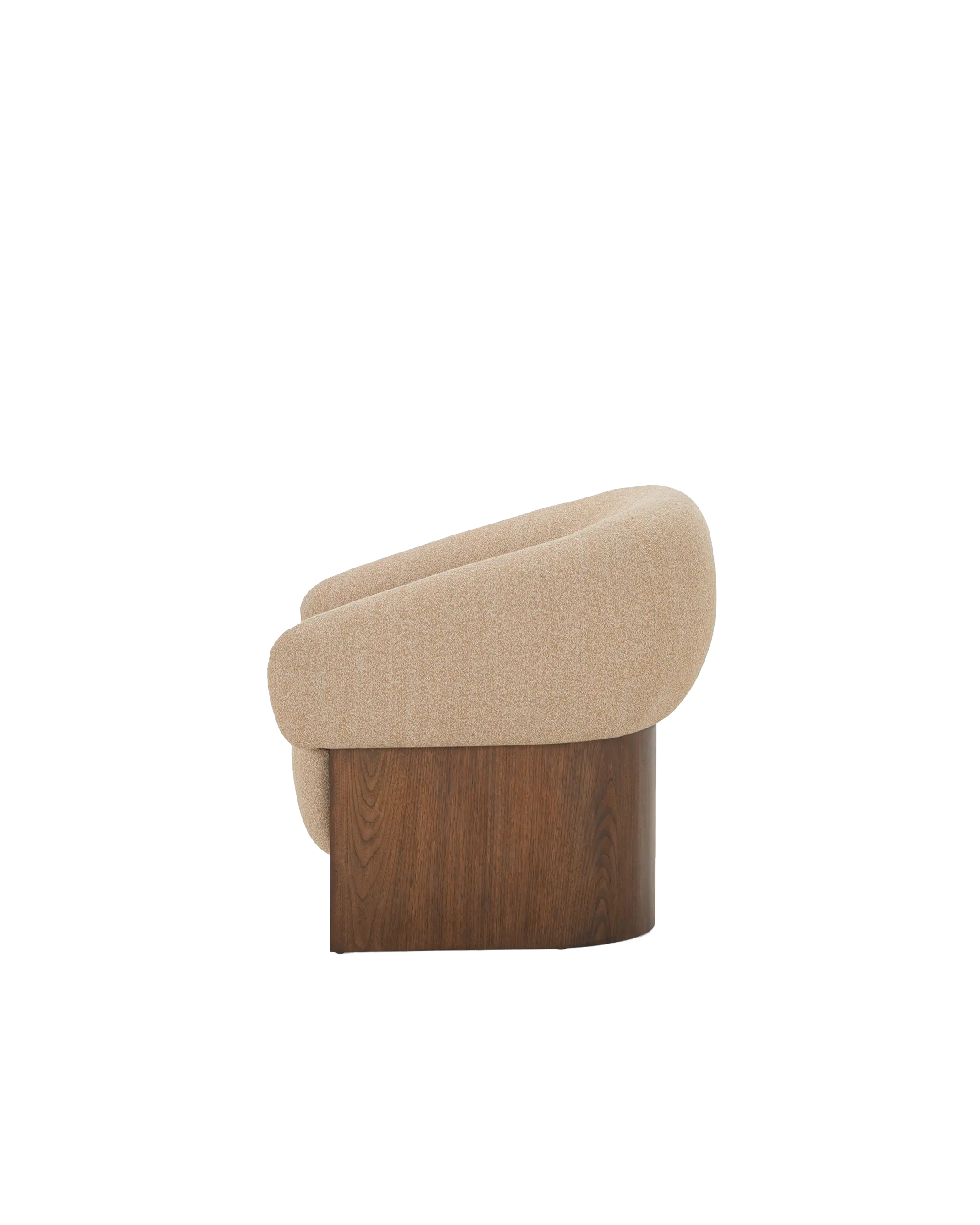 The Arcella Accent Chair pairs the grounded elegance of a walnut veneer over a solid rubberwood base with the soft refinement of a plush, gently curved upholstered back of 100% recycled GRS-certified polyester that is OEKO Tex 100.