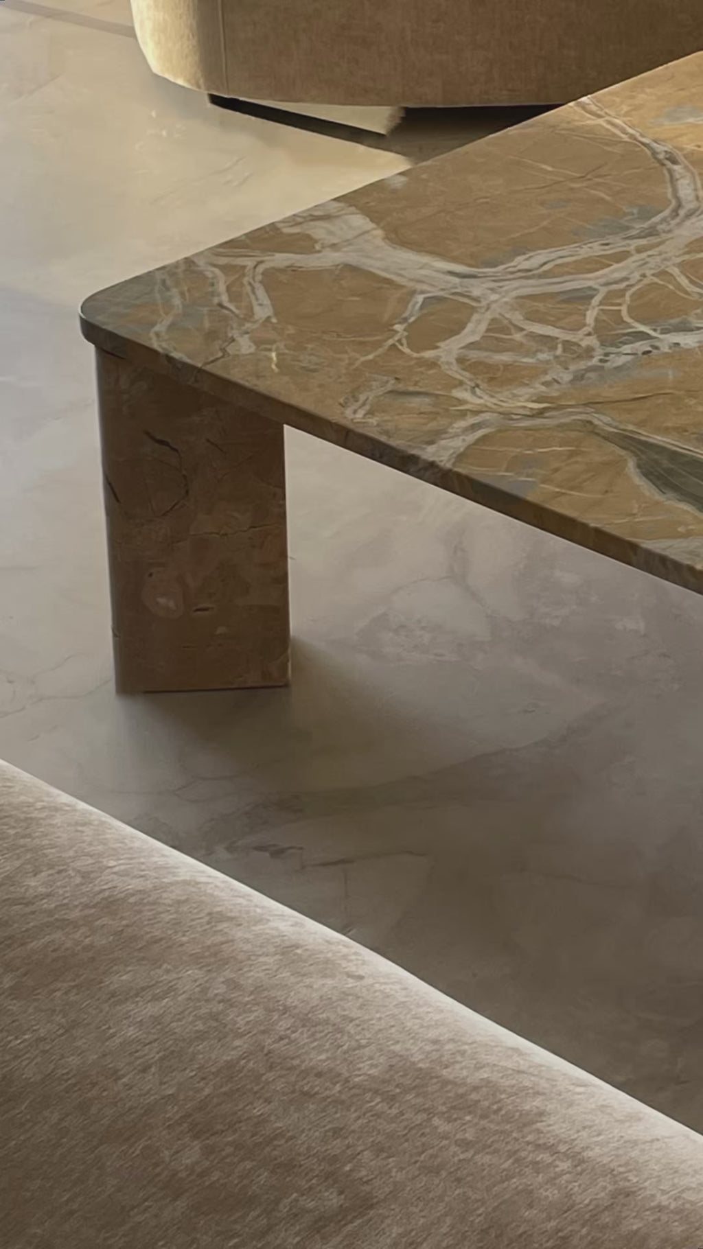 Intersecting through material and form of unique marble striations dance across the surface of its design, traced by the earth, adding intrinsic elements to any interior. Soft edges materialize through solid orange lavante marble, the segmented base taking shape with an angular cut from a rounded form.