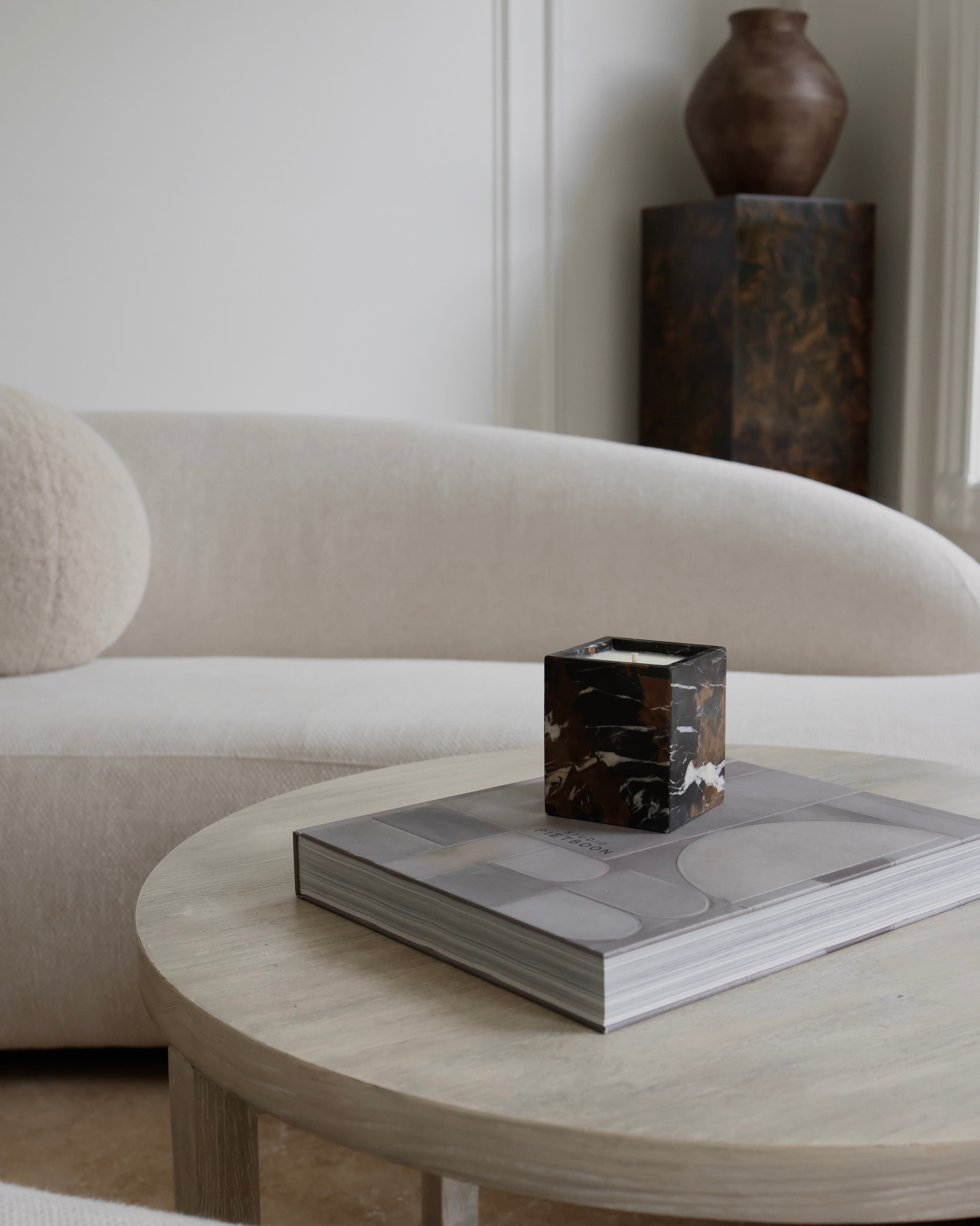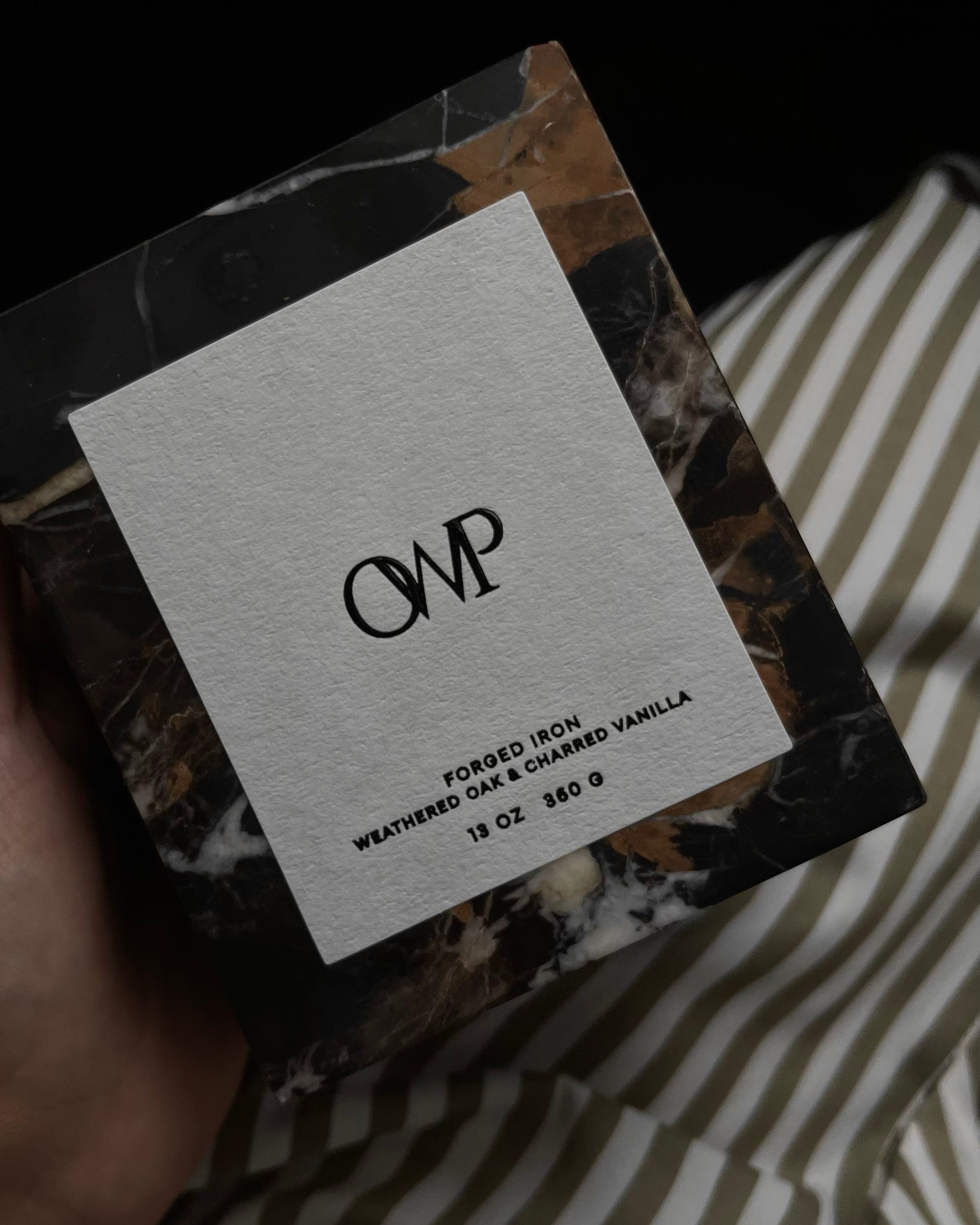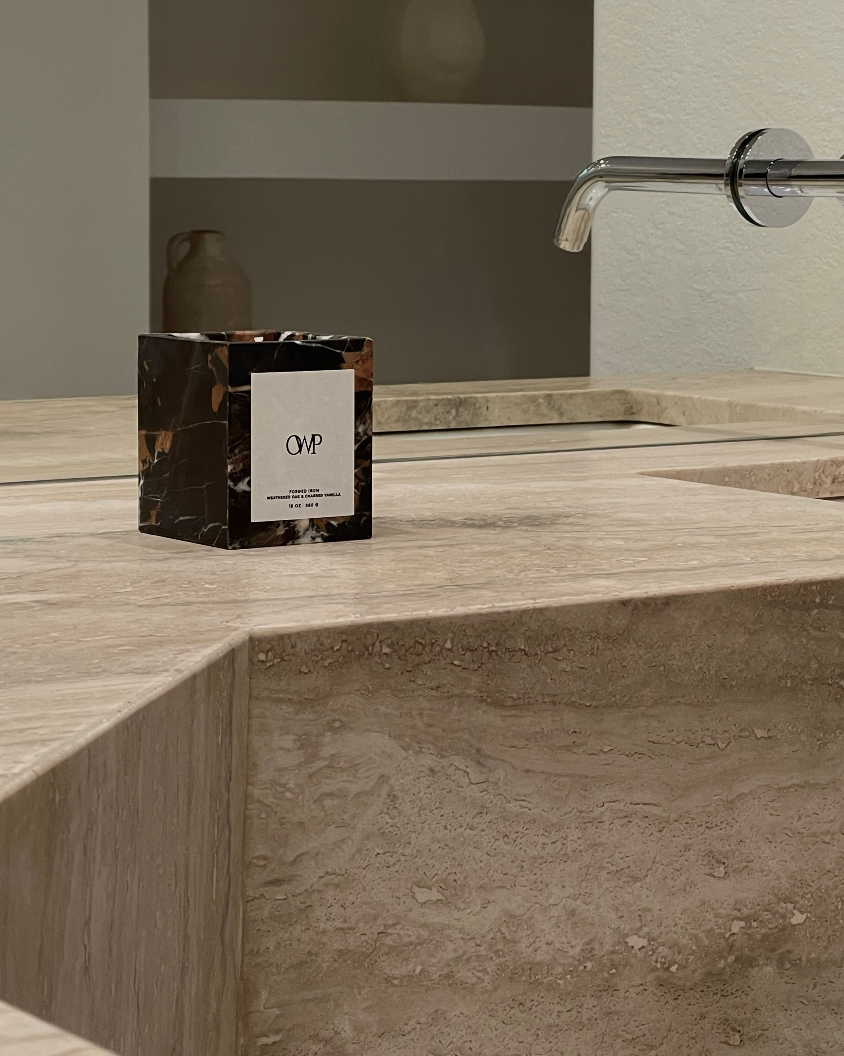 Hand-poured in the USA, the Forged Iron Marble Candle embodies understated luxury. Clean-burning and non-toxic, it features a natural blend of weathered oak and charred vanilla with notes of jasmine and saffron, set within a timeless Dark Emperador marble vessel.